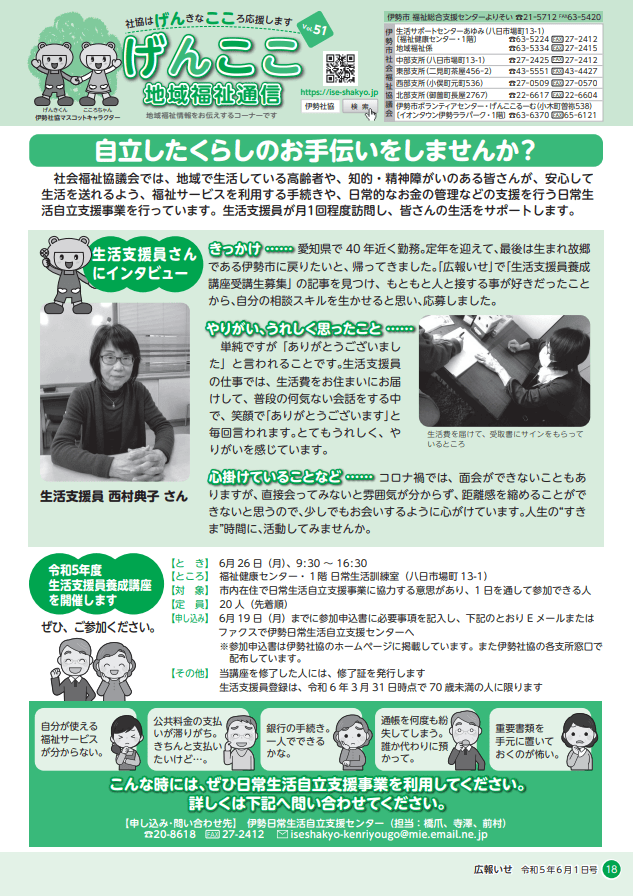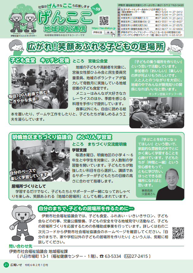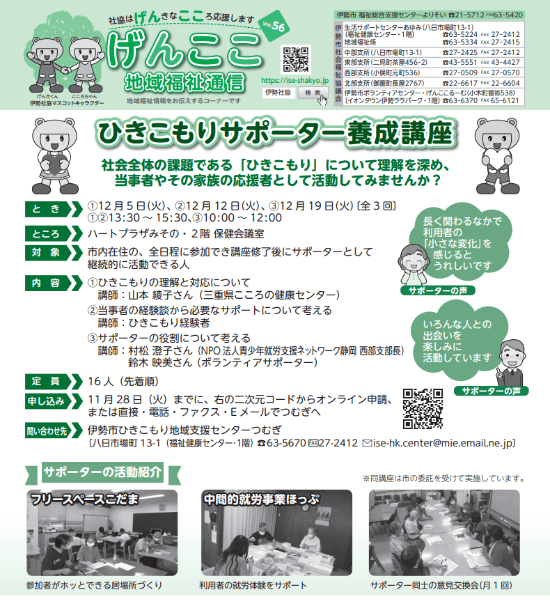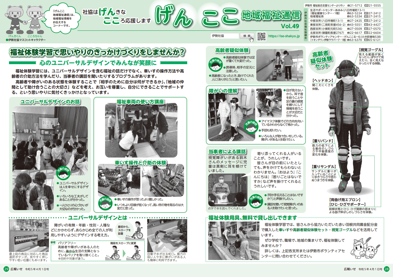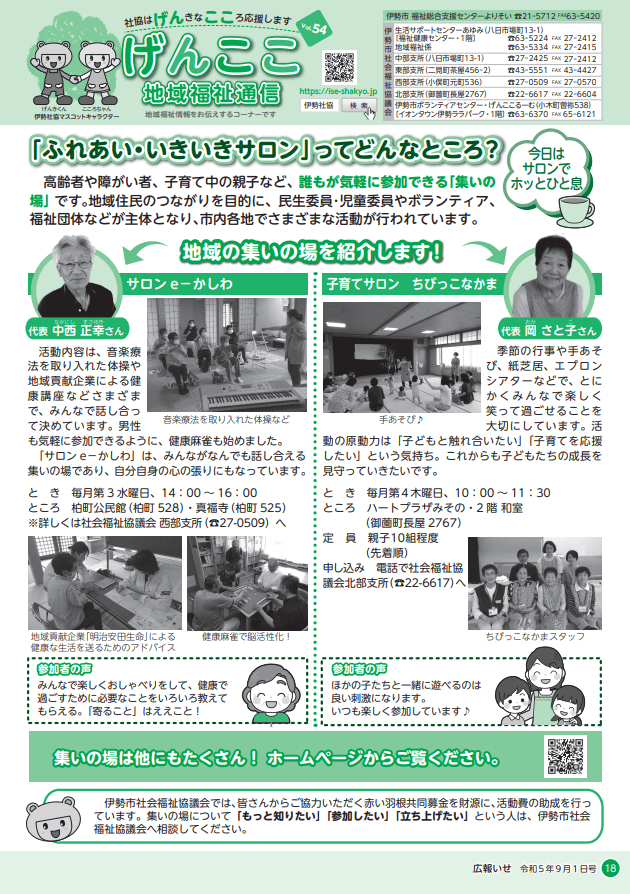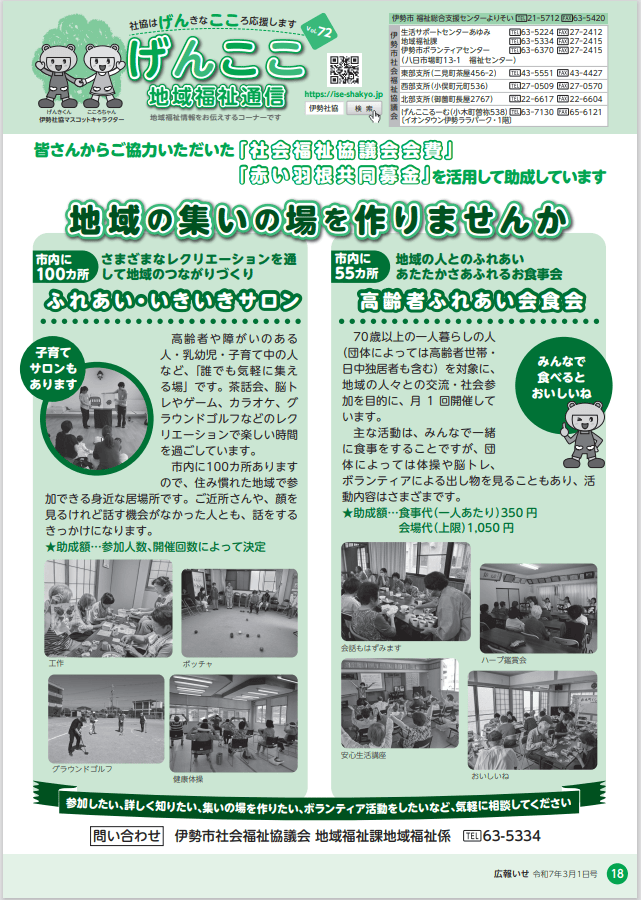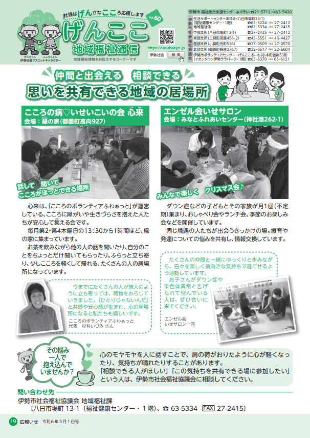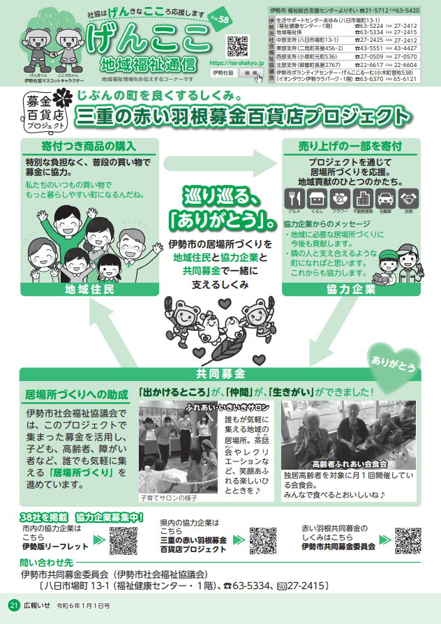 「げんここ地域福祉通信」は、伊勢市社会福祉協議会が発行する地域福祉情報誌です。「げんここ」という名称は、社協のマスコットキャラクター「げんきくん」と「こころちゃん」に由来し、「社協はげんきなこころを応援します」というメッセージが込められています。