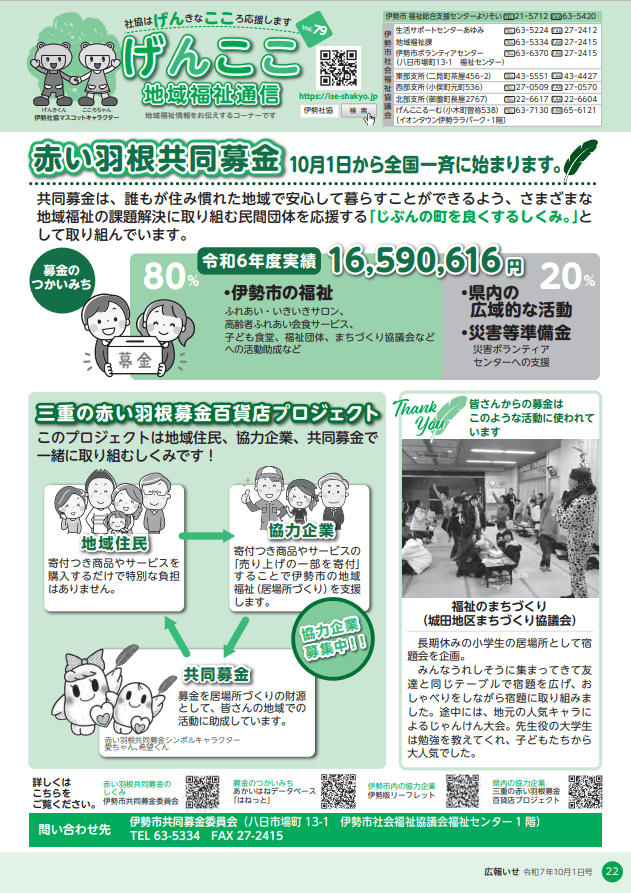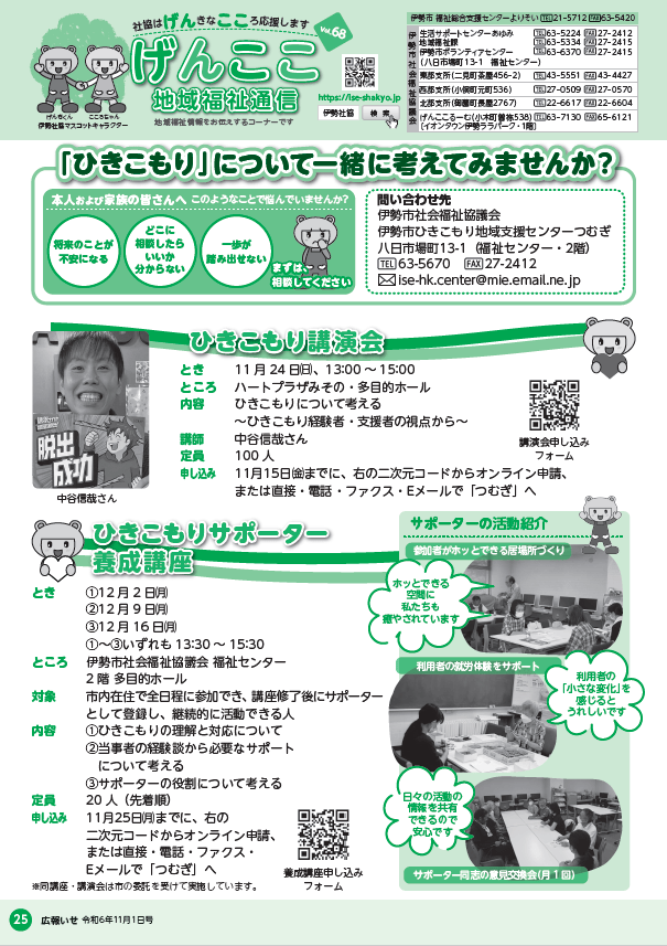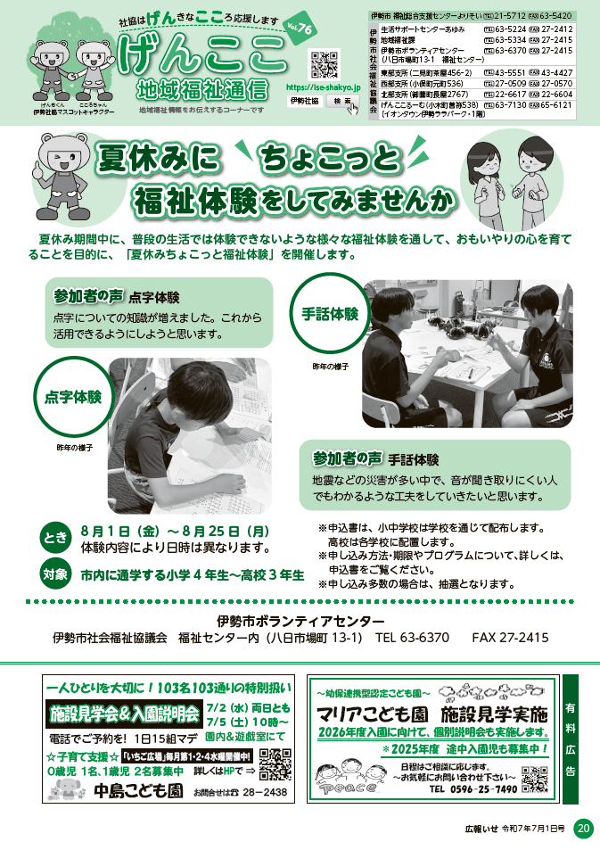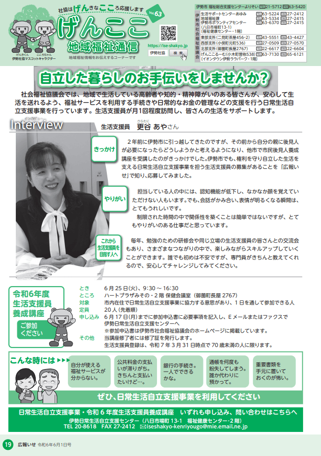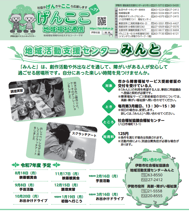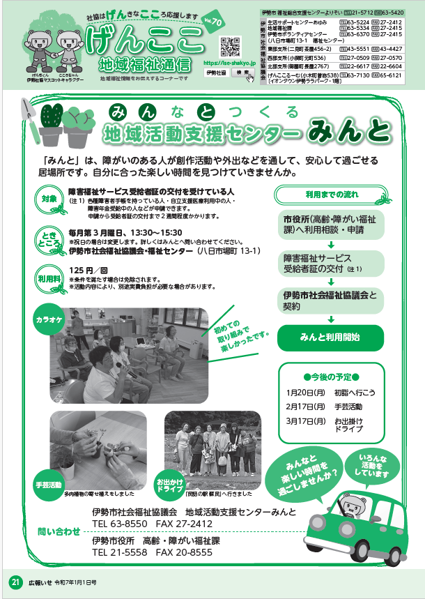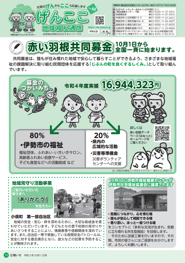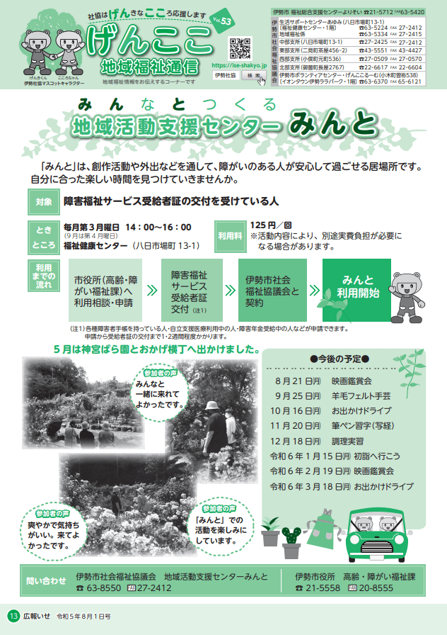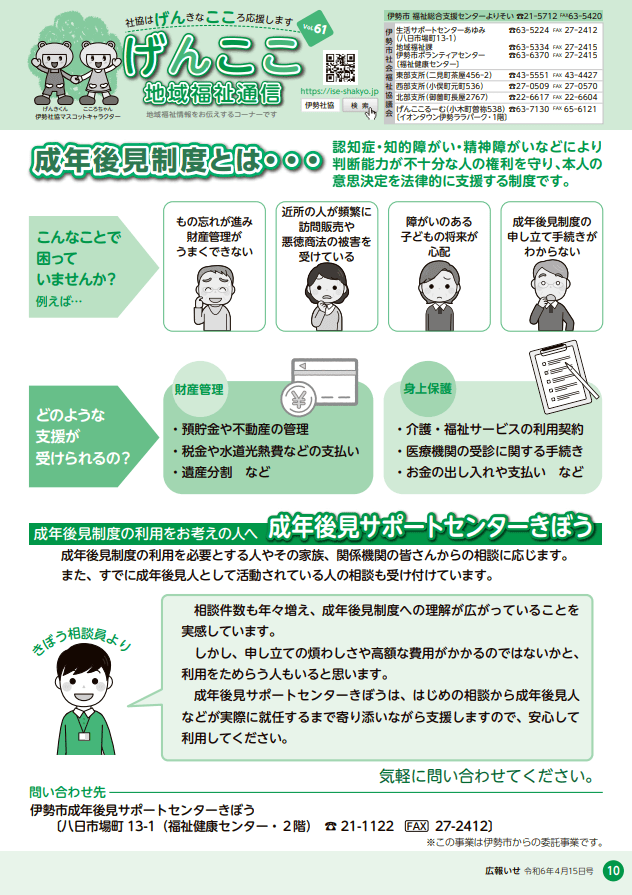 「げんここ地域福祉通信」は、伊勢市社会福祉協議会が発行する地域福祉情報誌です。「げんここ」という名称は、社協のマスコットキャラクター「げんきくん」と「こころちゃん」に由来し、「社協はげんきなこころを応援します」というメッセージが込められています。