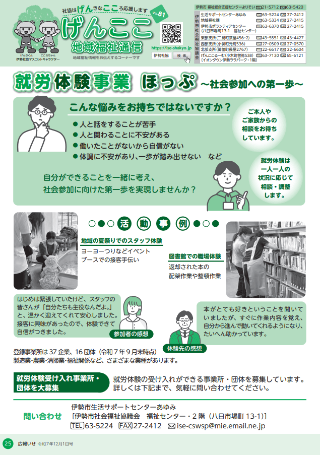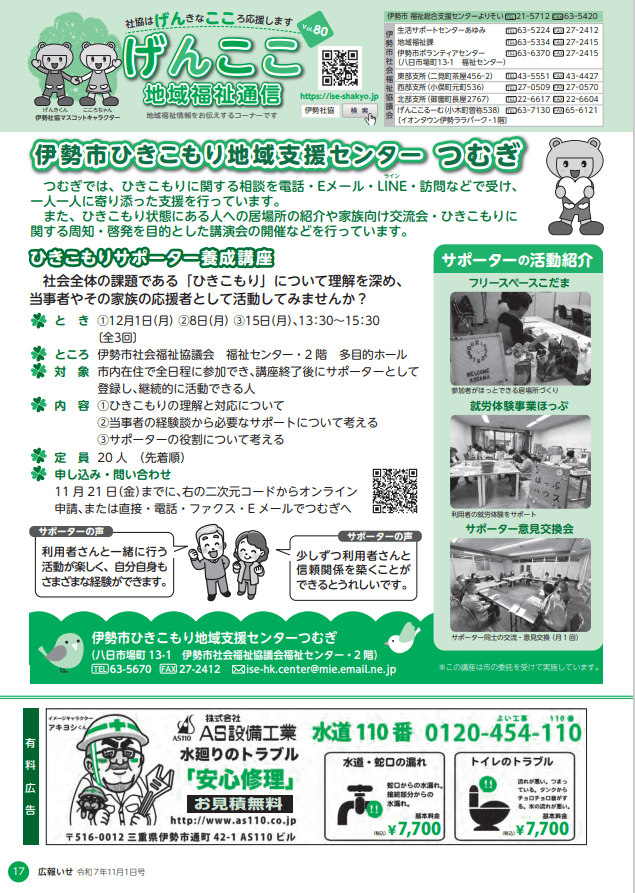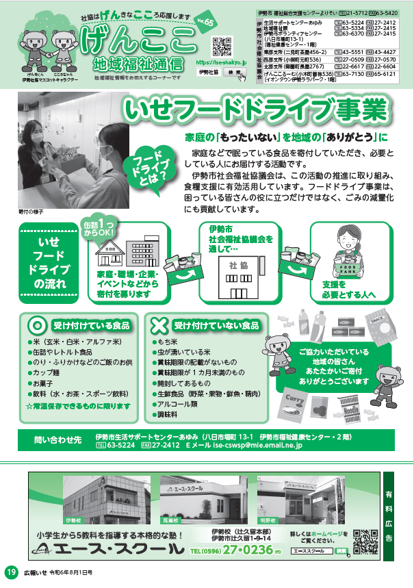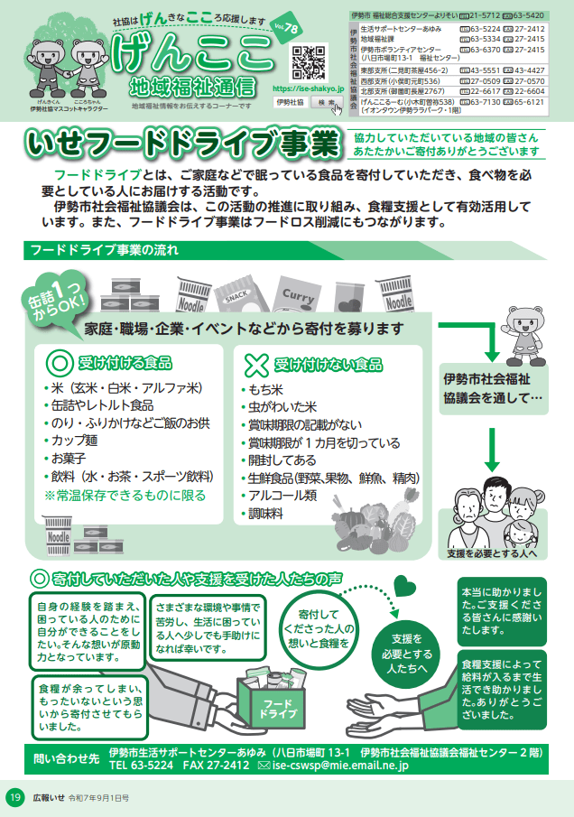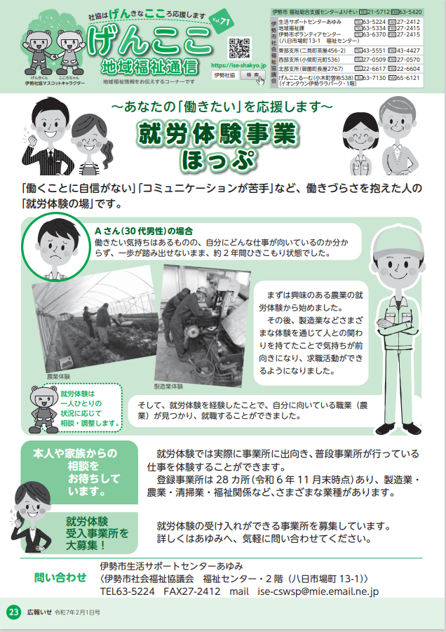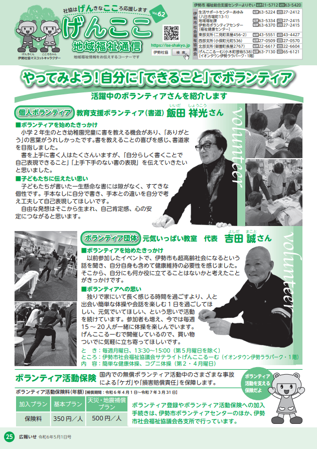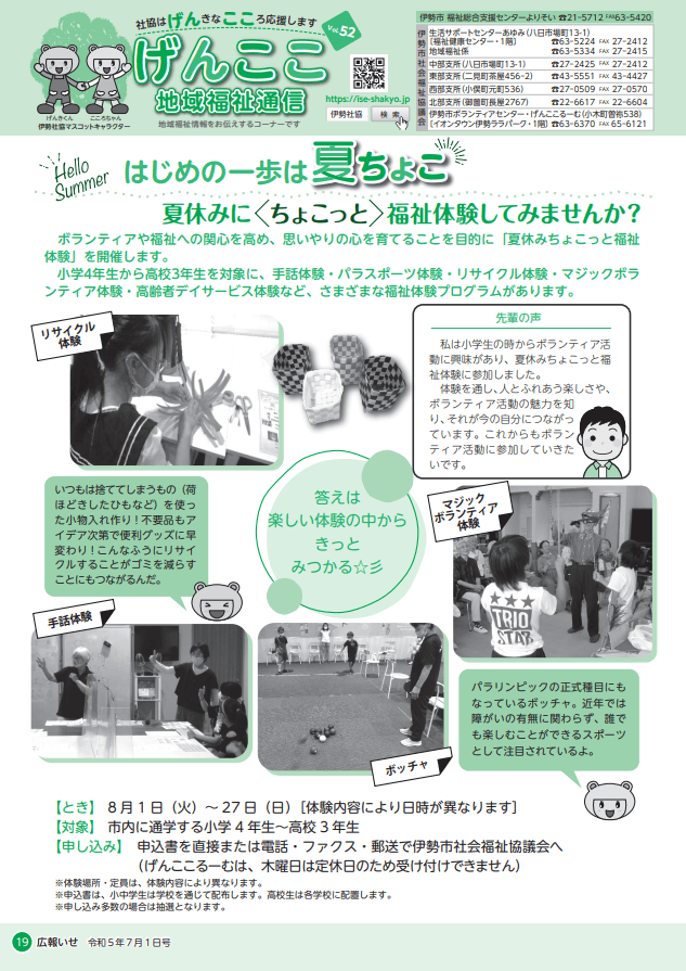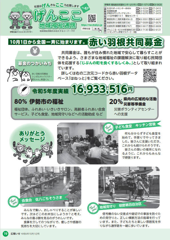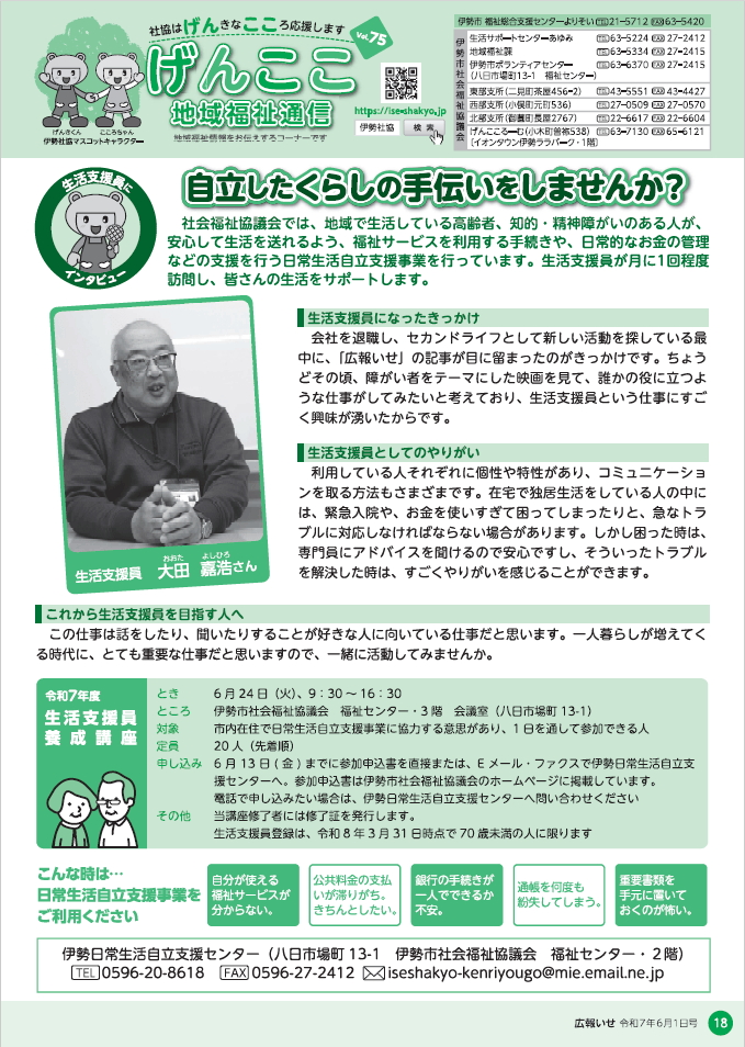 「げんここ地域福祉通信」は、伊勢市社会福祉協議会が発行する地域福祉情報誌です。「げんここ」という名称は、社協のマスコットキャラクター「げんきくん」と「こころちゃん」に由来し、「社協はげんきなこころを応援します」というメッセージが込められています。