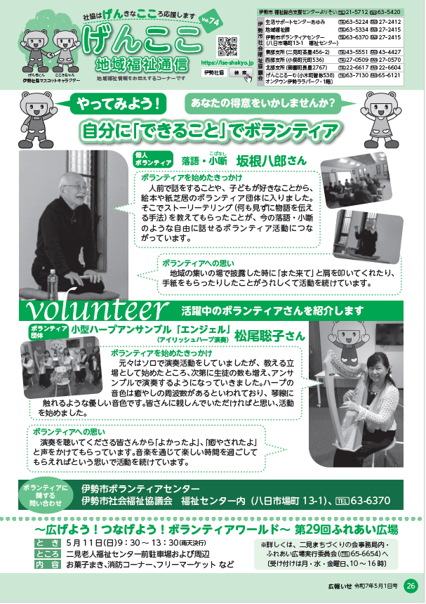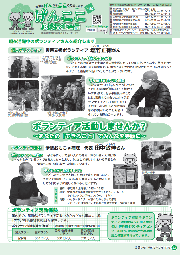 伊勢市ボランティアセンターでは、ボランティア情報を広く市民の皆様に お届けするための広報紙「いせボラにゅーす」を発行しています。