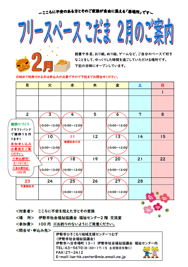 伊勢市社会福祉協議会福祉センター(伊勢市八日市場町13-1)2階にて開所しています。