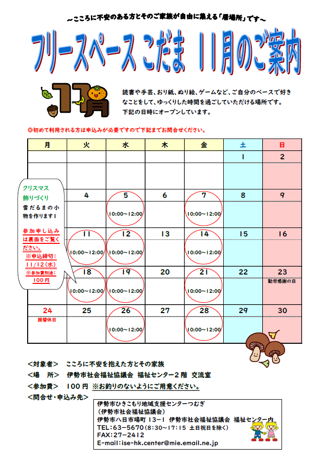 伊勢市ひきこもり地域支援センターつむぎ(TEL0596-63-5670)までご連絡ください。