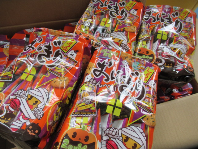 10月15日、ハロウィンイベント用に、マスヤ様から「おにぎりせんべい(ハロウィンバージョン)」を本社にていただきました。