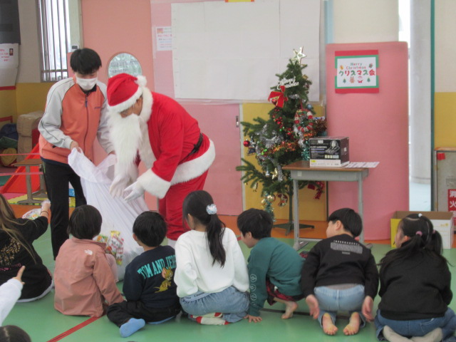 サンタさんへの質問コーナーでは、「どこから来たの?」「好きな食べ物は?」など、数々の質問が飛び交いました。そしてお楽しみのプレゼント。サンタさんの大きな袋に入った物が、一人ひとりに手渡しされました。