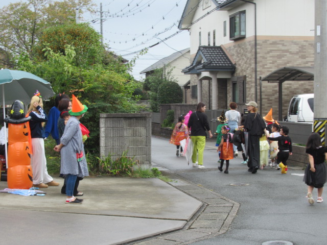 小俣小学校体育館に集合し、そこから13か所のブースを巡り、カードにスタンプを押してもらい、「トリック オア トリート」と合言葉を言っておやつをもらい、みんなホクホクの笑顔でした。そして、14か所目のブースである児童館へゴールイン。児童館近くのいつもの道が、この日ばかりは「ハロウィン☆メルヘンロード」となりました。