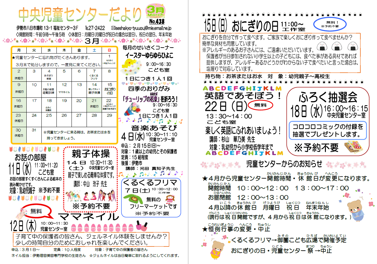 一般お知らせ 中央児童センターだより3月号を公開しました 2026年2月19日 中央児童センターだより3月号を公開しました 4月から開館時間・休館日が変更になりますので、おたよりをご確認ください。 これからも中央児童センターにたくさん遊びに来て下さいね 中央児童センター3月たより