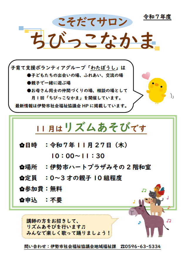 令和7年11月27日(木)10:00より、子育てサロン「ちびっこなかま」を開催します