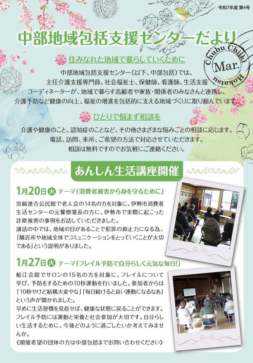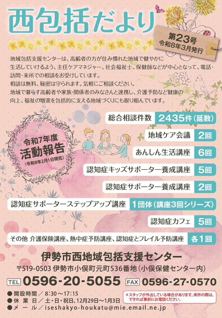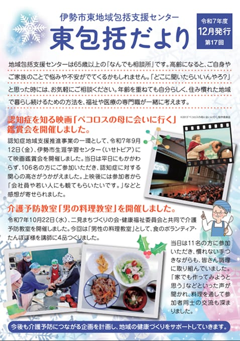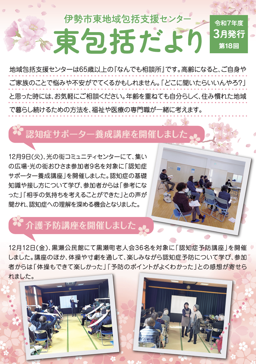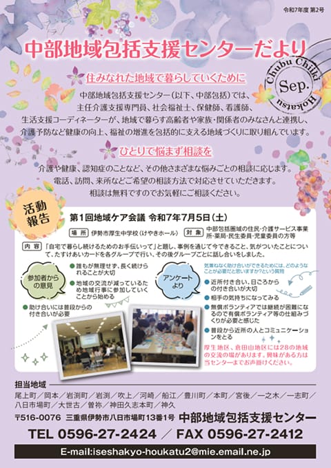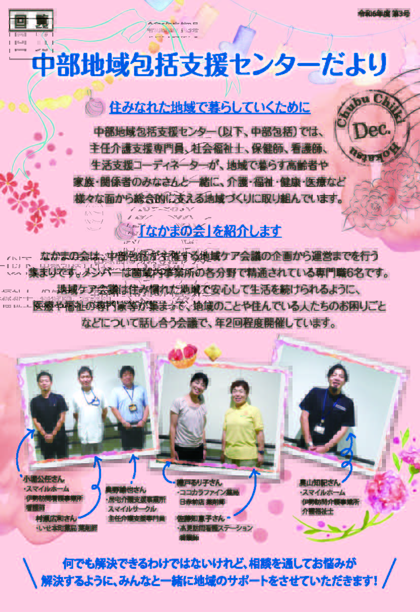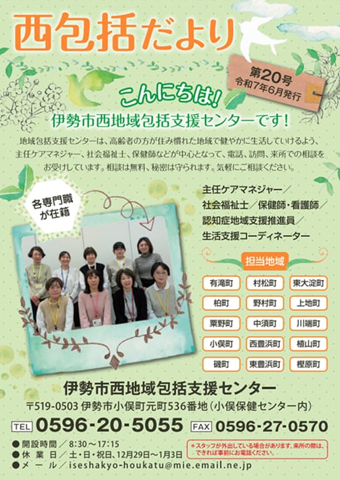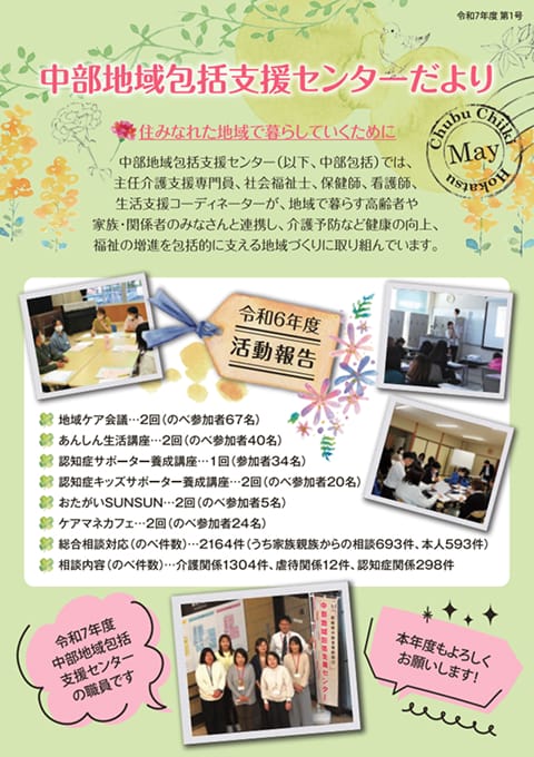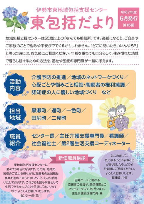 地域包括支援センターとは、地域で暮らす高齢者のみなさんが住み慣れた地域でいつまでも健やかに生活していけるよう相談、支援を行うところです。地域住民の保健医療の向上及び福祉の増進を包括的に支援することを目的とし、保健師、社会福祉士、主任介護支援専門員等がチームで活動しています。