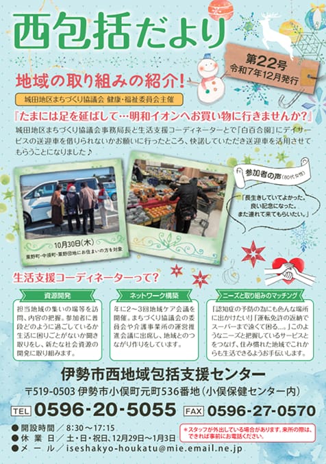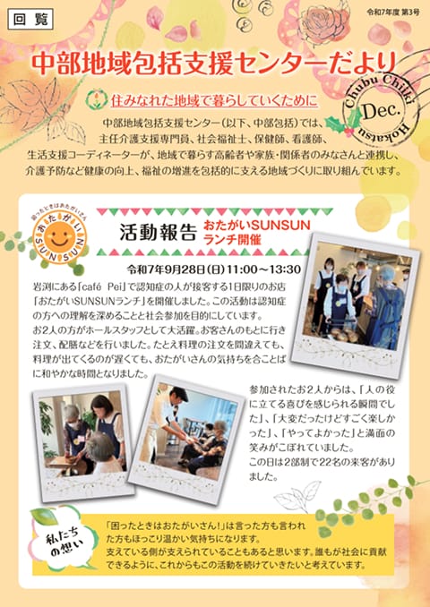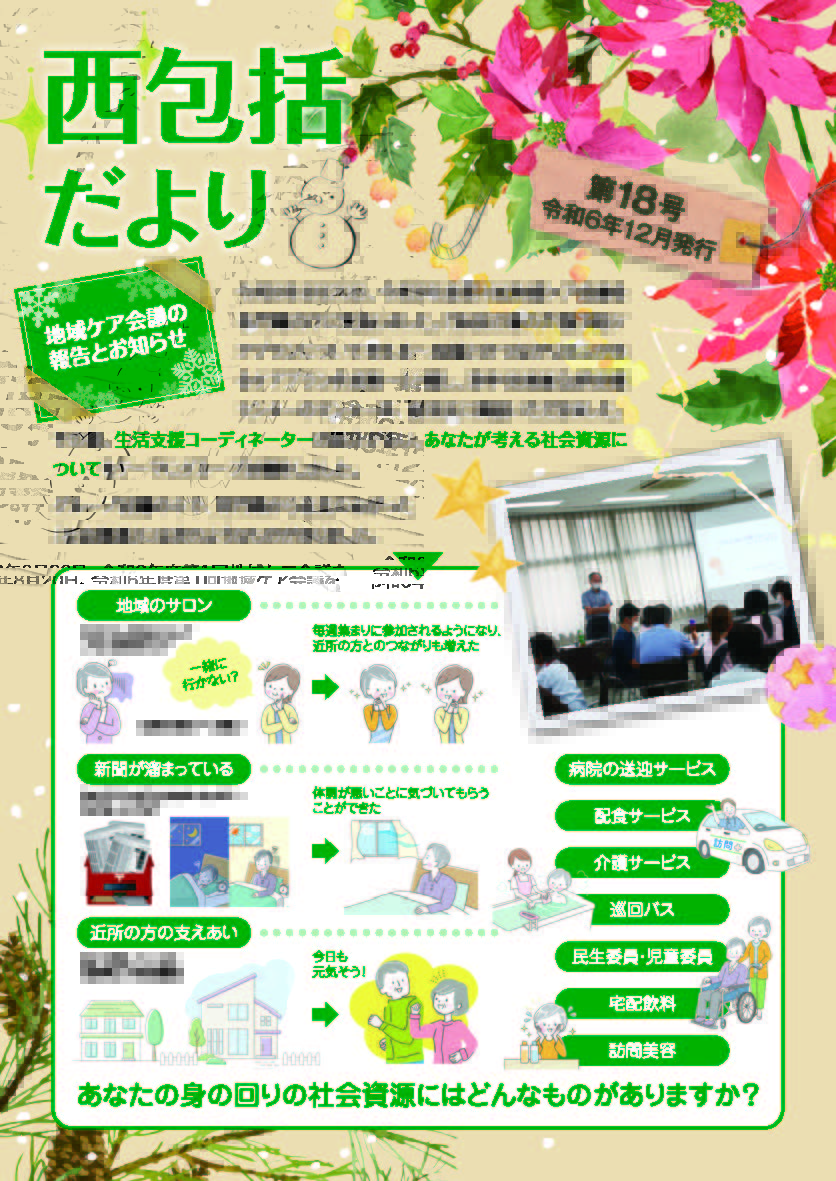 地域高齢者等が住み慣れた地域で安心してその人らしい生活をしていくためにどのような支援が必要かを把握し、 地域における適切なサービス、関係機関及び制度の利用に繋げます。