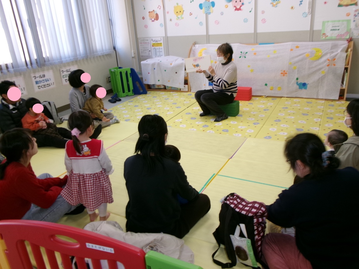 御薗こども広場です。3月10日(火)、おはなしプーさんと伊勢図書館スタッフの方による読み聞かせを行いました。
